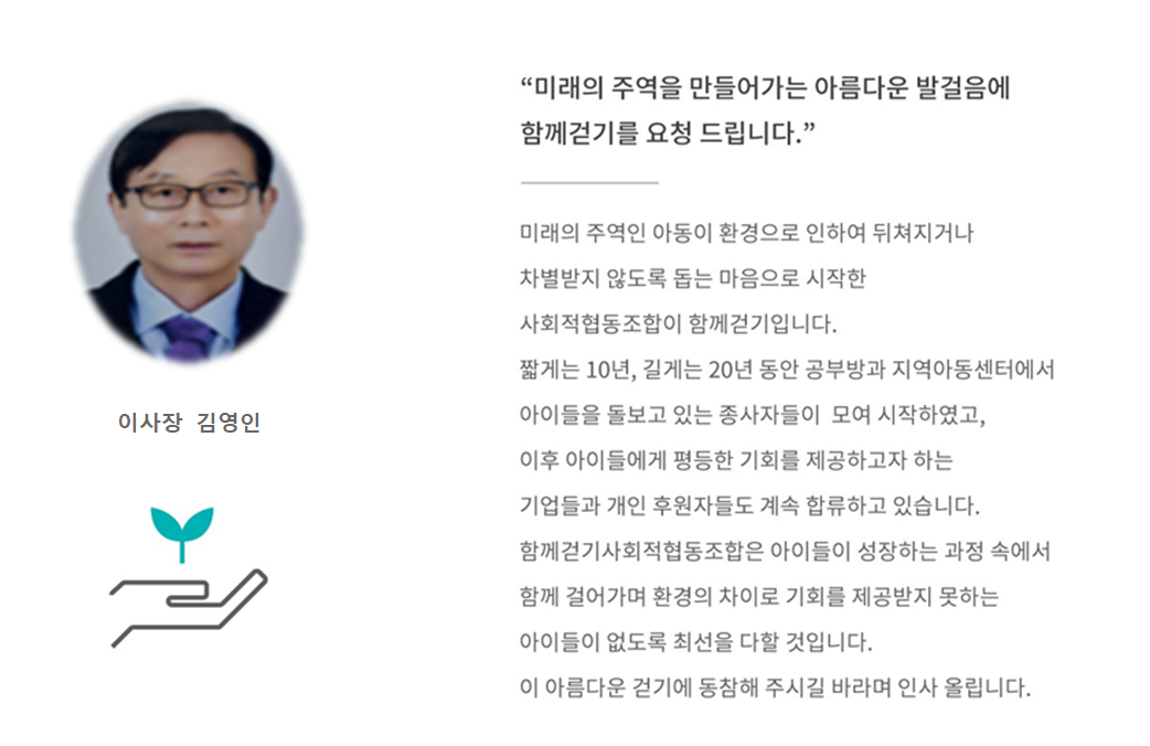 함께걷기사회적협동조합(이하 ‘회사’라 함)는 이용자 개인 정보를 중요시하며, 정보통신망 이용촉진 및 정보보호 등에 관한 법률‘을 준수하여 관련 법령에 의거한 개인정보 취급방침을 정하고 이용자 권익 보호에 최선을 다하고 있습니다. 회사는 개인정보 취급방침을 통하여 이용자가 제공하는 개인정보가 어떠한 용도와 목적으로 이용되고 있으며, 개인정보 보호를 위해 어떠한 조치가 취해지고 있는지 알려드립니다. 회사의 개인정보 취급방침은 정부의 법률 및 지침 변경이나 회사 내부의 방침 변경 등으로 인하여 변경될 수 있으며, 개인정보 취급방침을 개정할 경우 홈페이지에 게시하여 개정된 사항을 쉽게 알아볼 수 있도록 하고 있습니다. 제1조(수집하는 개인정보의 항목 및 수집 방법) ① 회사는 이용자가 홈페이지에서 회원가입 시 회원식별 및 최적화된 서비스 제공을 위해 다음의 정보를 수집합니다. 필수항목: 성명, 생년월일, 주소, 전화번호, 휴대전화번호, 성별, 로그인ID, 비밀번호, 비밀번호 변경 질문/답변, 회원구분(참여회원, 수혜자, 일반 등),이메일 ② 이용자가 회사의 유료 서비스를 이용하는 과정에서 다음 각 호의 결제 정보들이 수집될 수 있습니다. 1. 신용카드 결제 시 : 카드사명, 신용카드번호 등 2. 통장이체 시 : 은행명, 은행계좌 등 ③ 이용자가 회사의 인터넷 서비스를 이용하는 과정에서 IP주소, 쿠키, MAC주소, 서비스 이용기록, 방문기록, 불량 이용기록 등의 정보들이 자동으로 생성되어 수집될 수 있습니다. ④ 회사는 다음 각 호의 방법으로 이용자의 개인정보를 수집합니다. 1. 홈페이지(회원가입, 상담게시판, 공개 게시판, 기타 개인정보를 바탕으로 하는 서비스 이용 등) 2. 텔레마케팅, 서면양식, 전화/팩스를 통한 회원가입 등 3. 제휴사로부터의 제공 4. 생성정보 수집 툴을 통한 수집 제2조(개인정보의 수집 및 이용 목적) ① 회사는 수집한 개인정보를 다음 각 호의 목적을 위하여 활용합니다. 이용자가 제공한 모든 정보는 목적 외의 용도로는 이용되지 않으며, 이용 목적이 변경될 경우에는 별도의 동의를 받는 등 필요한 조치를 이행합니다. 1. 홈페이지 회원가입 및 관리 : 회원 가입의사 확인, 회원제 서비스 제공에 따른 본인 식별∙인증, 회원자격 유지∙관리, 서비스 부정이용 방지, 만14세 미만 아동 개인정보 수집 시 법정대리인 동의 여부 확인, 각종 고지∙통지, 고충처리, 분쟁 조정을 위한 기록 보존 등 2. 재화 또는 서비스 제공 : 물품배송, 서비스 제공, 계약서․청구서 발송, 콘텐츠 제공, 맞춤서비스 제공, 본인인증, 연령인증, 요금결제․정산, 채권추심 등 3. 마케팅 및 광고에 활용 : 신규 서비스(제품) 개발 및 맞춤 서비스 제공, 이벤트 등 광고성 정보 전달 4. 고충처리 : 민원인의 신원 확인, 민원사항 확인, 사실조사를 위한 연락․통지, 처리결과 통보 등 5. 기타 : 가입횟수 제한, 분쟁조정을 위한 기록 보존, 인구통계학적 특성에 따른 서비스 제공 및 광고 게재, 접속 빈도 파악 또는 회원의 서비스 이용에 대한 통계 등 제3조(개인정보의 제3자 제공에 관한 사항) ① 회사는 이용자의 개인정보를 본 방침 제2조(개인정보의 수집 및 이용 목적)에서 명시한 범위 내에서만 처리하며, 동 범위를 초과하여 개인정보를 이용하거나 제3자에게 제공∙공개하지 않습니다. 단, 서비스 제공을 위해 필요한 경우 다음 각 호의 사항을 이용자에게 알리고 동의를 받은 후 제공합니다. 1. 개인정보를 제공받는 자 2. 개인정보를 제공받는 자의 개인정보 이용 목적 3. 제공하는 개인정보의 항목 4. 개인정보를 제공받는 자의 개인정보 보유 및 이용 기간 ② 회사는 다음과 같이 개인정보를 제3자에게 제공하고 있습니다. ○ 결제 서비스 제공 목적 1. 개인정보를 제공받는 자: 사단법인 금융결제원, 다우데이타, 씨엠에스메카 2. 개인정보를 제공받는 자의 개인정보 이용 목적: 결제서비스 3. 제공하는 개인정보의 항목: 이름, 생년월일, 신용카드 또는 은행계좌 정보, 전화번호, 주소 4. 개인정보 보유 및 이용 기간: 회원의 개인정보 제공 동의 시점부터 서비스 제공기간 만료일까지 제4조(개인정보의 보유 및 이용기간) ① 회사는 원칙적으로 개인정보 수집 및 이용목적이 달성되거나, 보유 및 이용기간이 경과된 후에는 해당 정보를 지체 없이 파기합니다. ② 회사는 회사 내부 방침 및 관계 법령의 규정에 의하여 보존할 필요가 있는 다음 각 호의 정보를 제1항의 규정에도 불구하고 일정한 기간 동안 보관할 수 있습니다. 1. 성명, 생년월일, 주소, 전화번호, 휴대전화번호, 성별, 로그인ID, 비밀번호, 비밀번호 변경 질문/답변, 회원구분(후원자, 수혜자, 일반 등),이메일 등 회원 개인을 식별할 수 있는 정보 가. 보존 근거: 회사의 내부 방침 및 수사 협조 나. 보존 기간: 1년 2. 계약 또는 청약철회 등에 관한 기록 가. 보존 근거: 전자상거래 등에서의 소비자보호에 관한 법률 나. 보존 기간: 5년 3. 소비자 불만 또는 분쟁처리에 관한 기록 가. 보존 근거: 전자상거래 등에서의 소비자보호에 관한 법률 나. 보존 기간: 3년 4. 컴퓨터통신, 인터넷 로그기록 자료, 접속지 추적 자료 등 통신 사실 확인 